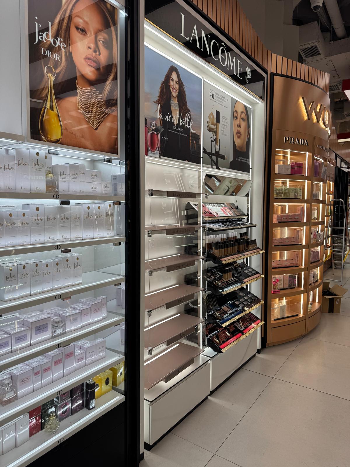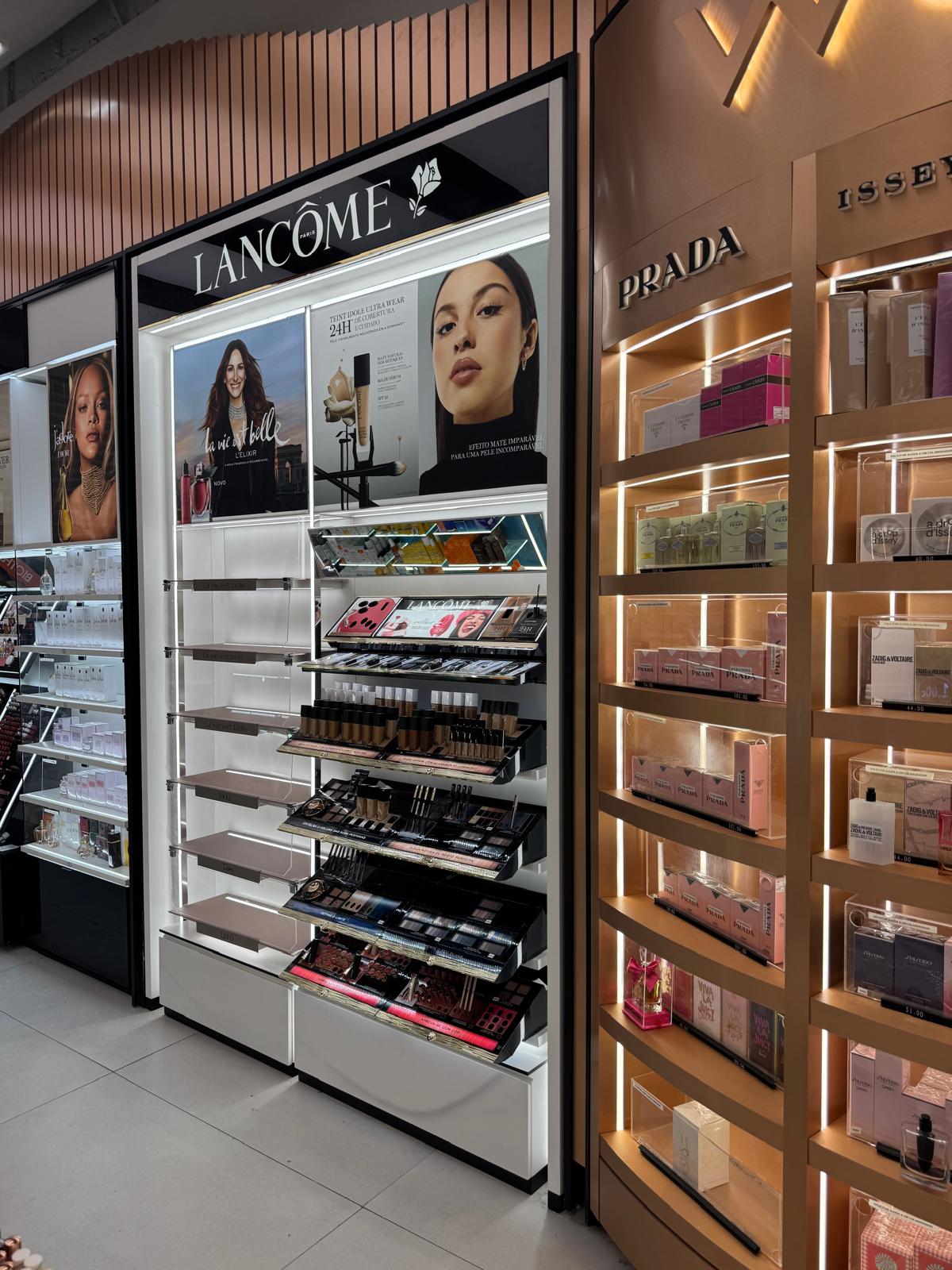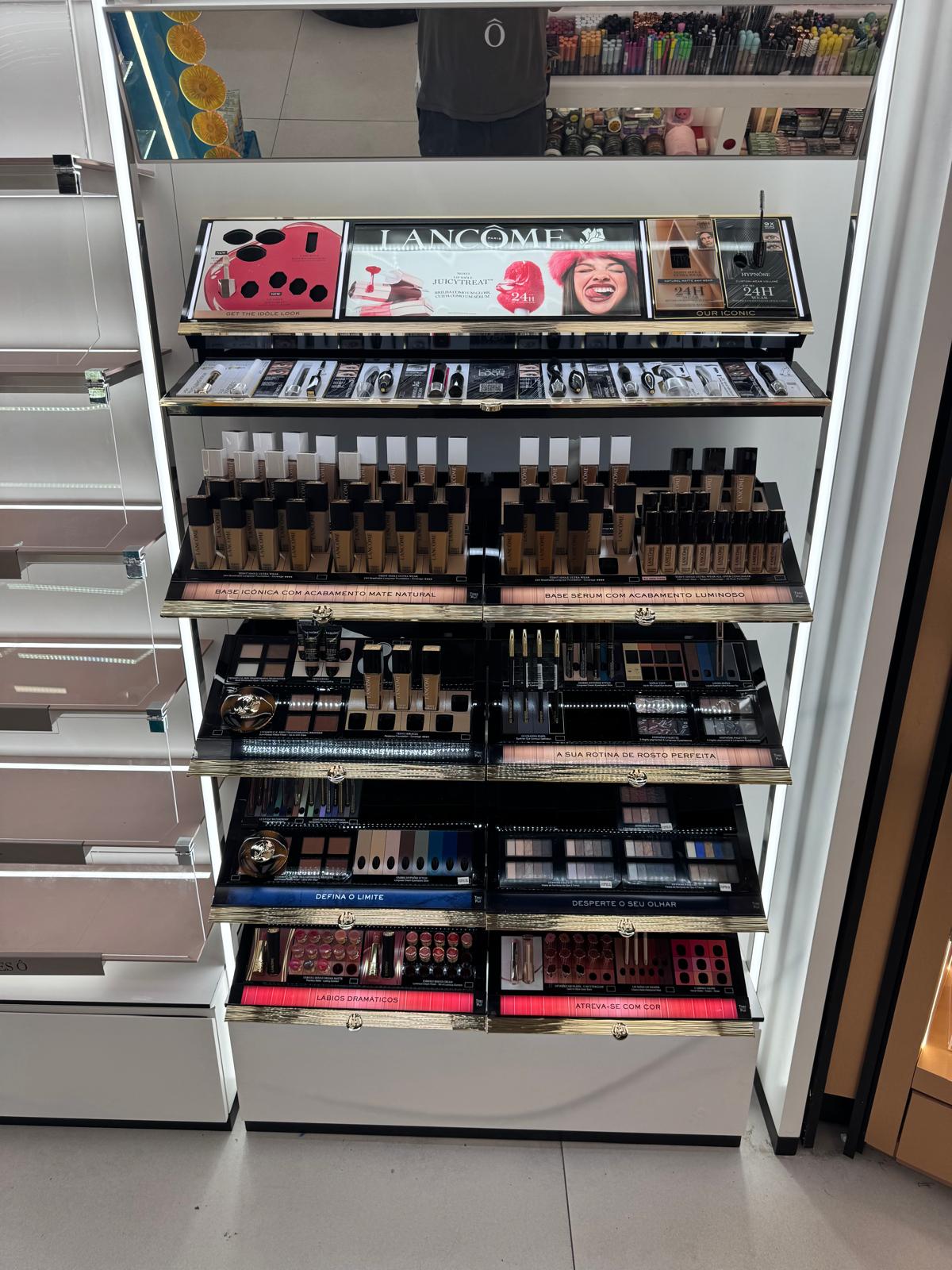 Realización de backwall de dos bajantes en la perfumería Primor del Centro Comercial Cascais, para LANCOME.
