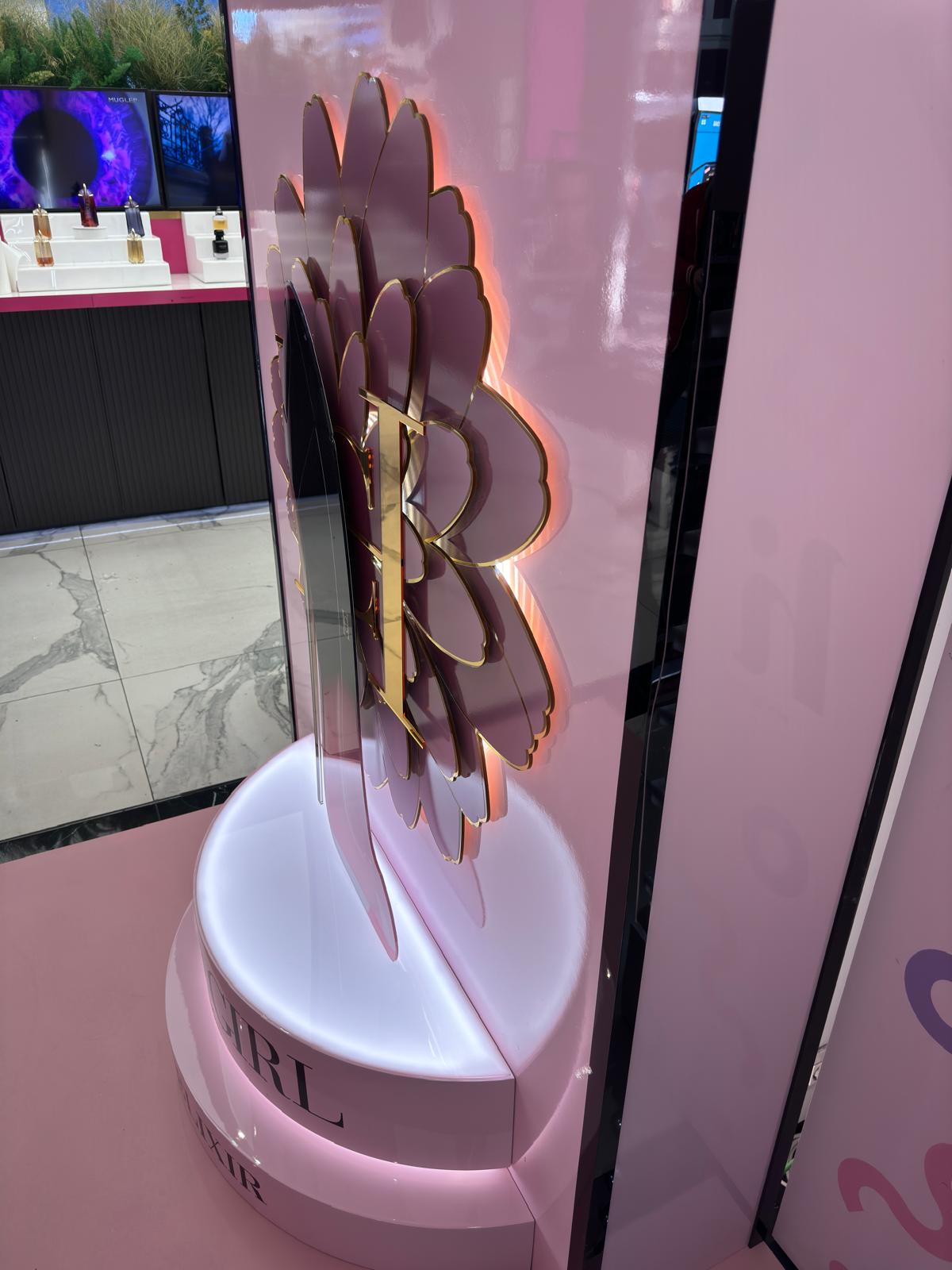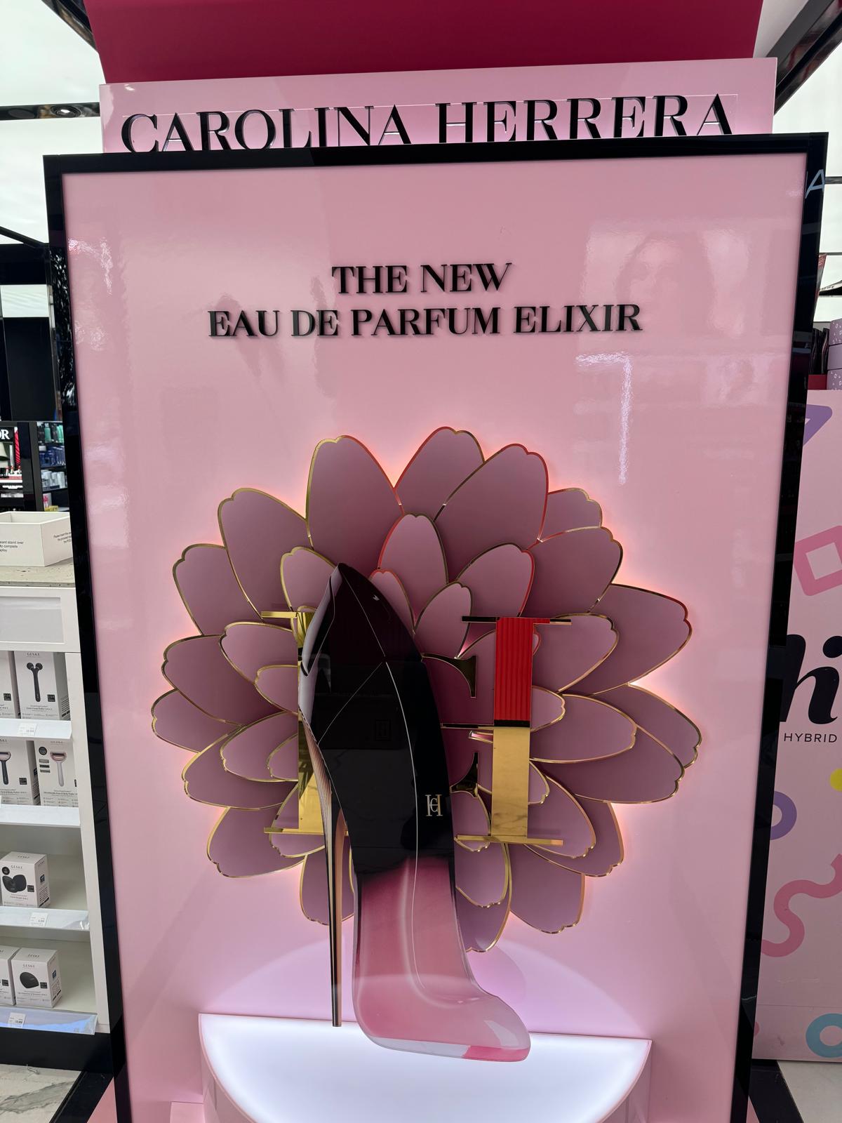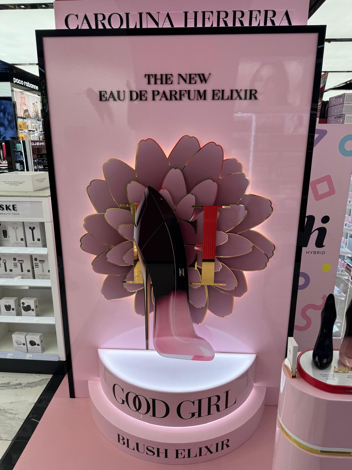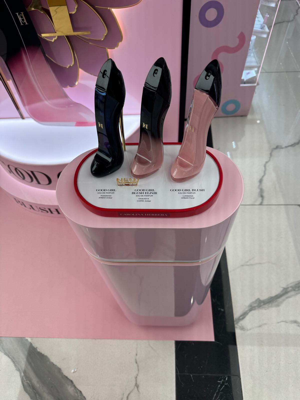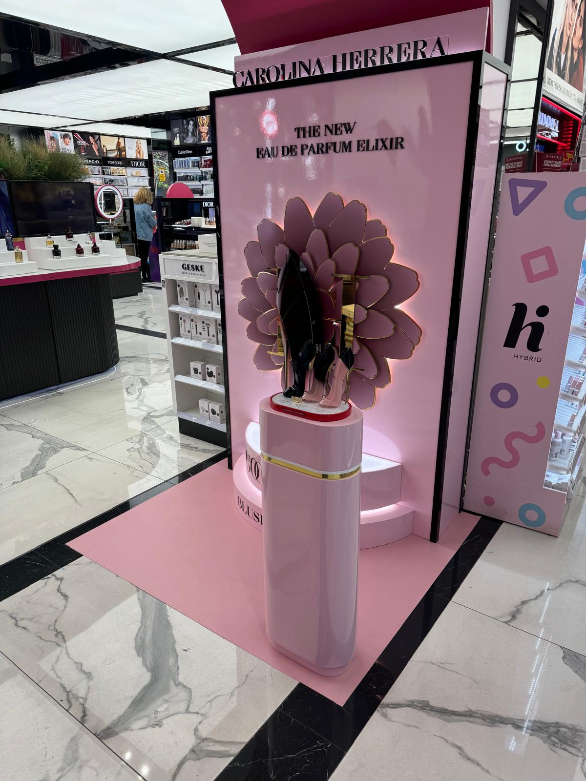 Espacio promocional para Carolina Herrera BLUSH ELIXIR, con mostrador lacado en rosa brillo, con tira perimetral en oro brillo y blanco brillo. Base curva lacada en rojo brillo, con metacrilato transparente.