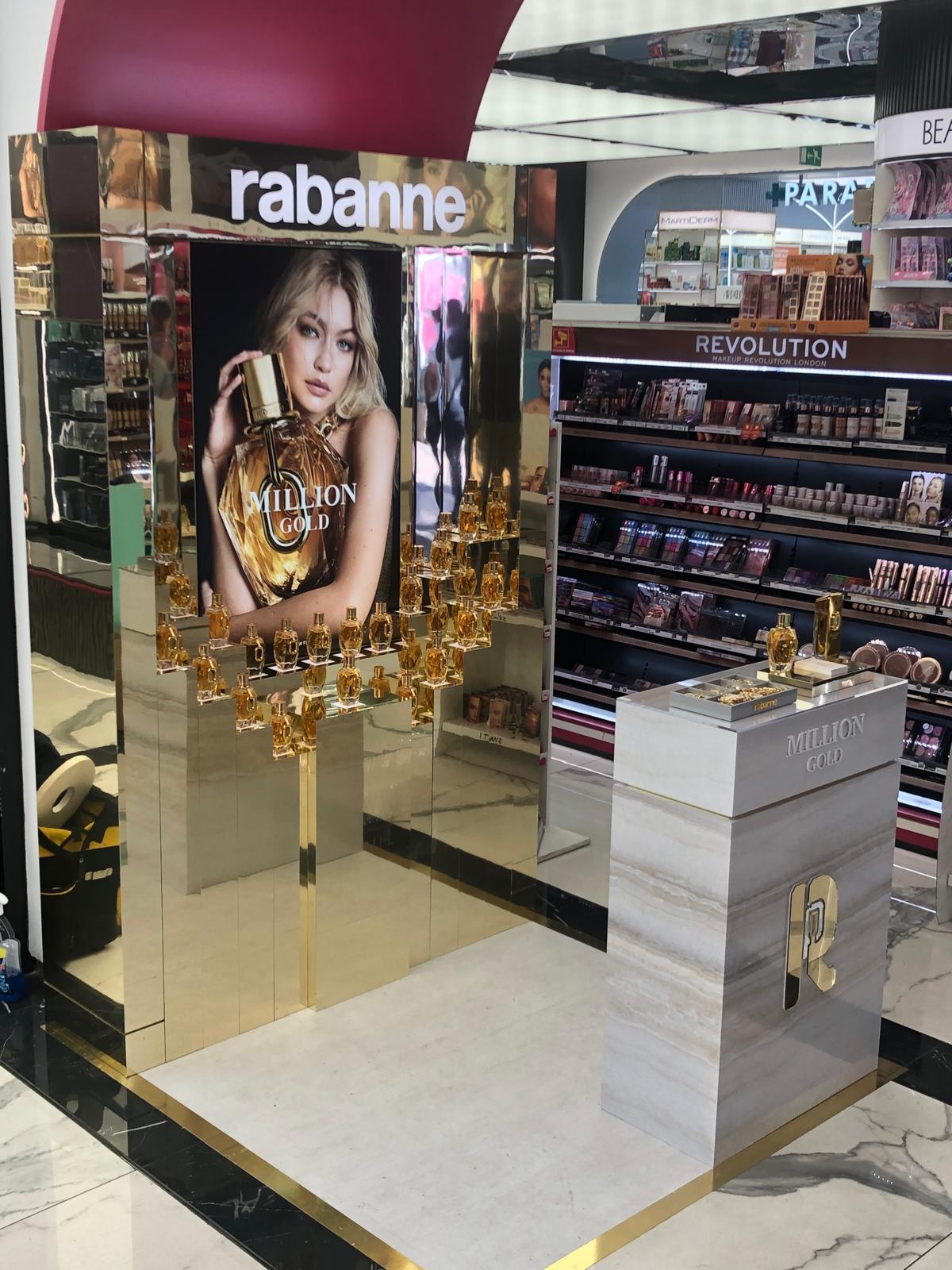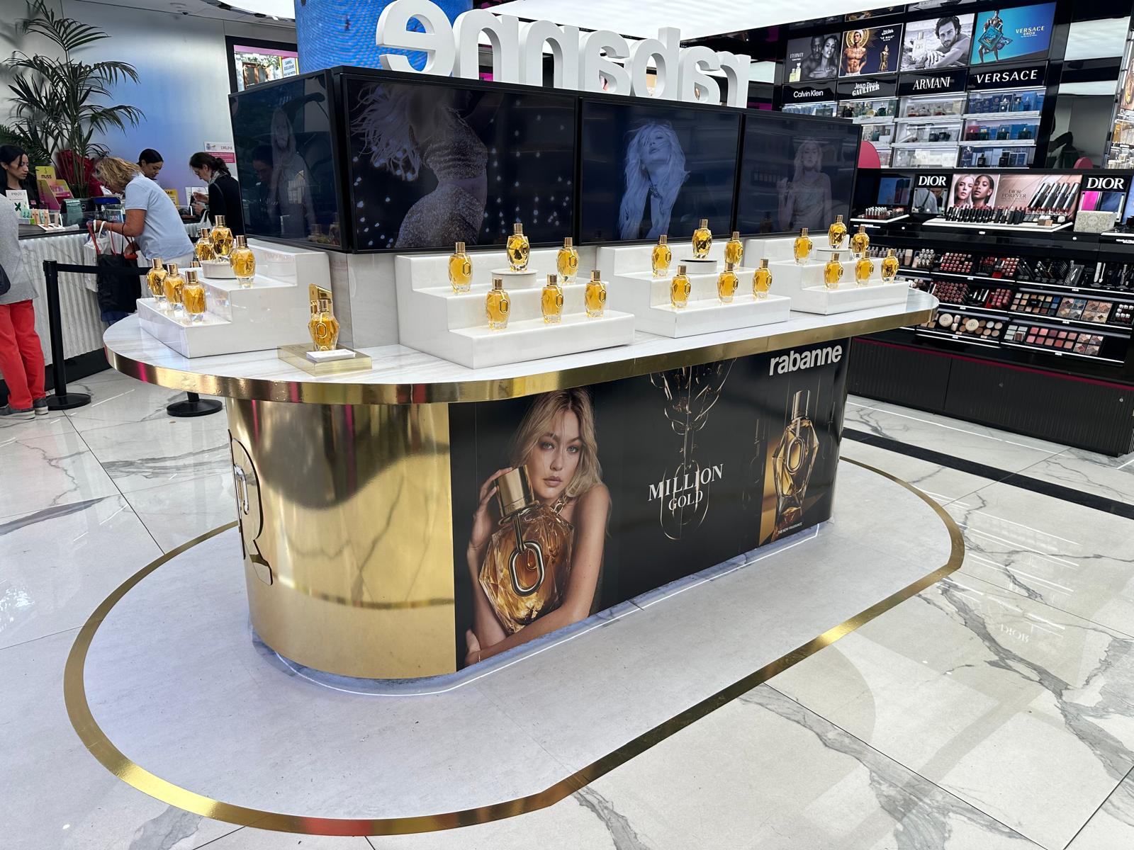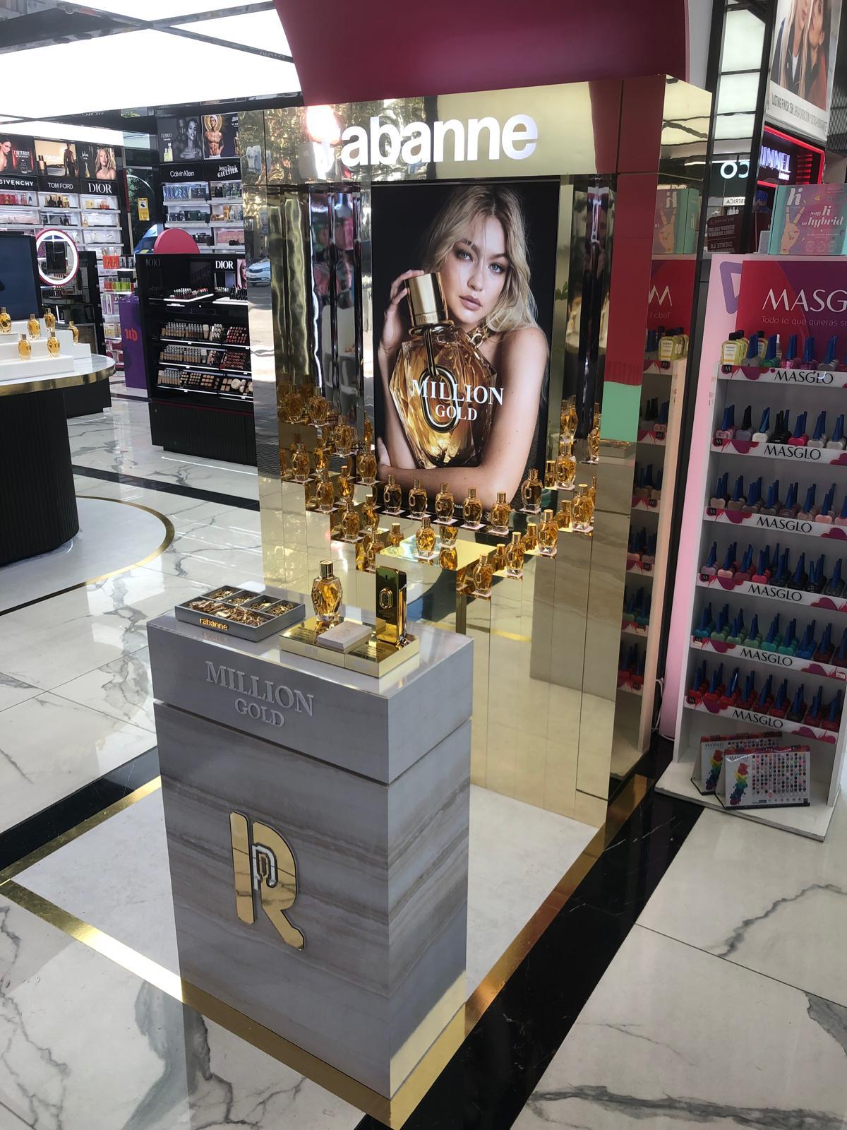 Espacio promocional para Rabanne – Million Gold, con dos zonas independientes, una con mostrador en DM vinilado y trasera y otra con góndola personalizada en bandoxal oro brillo