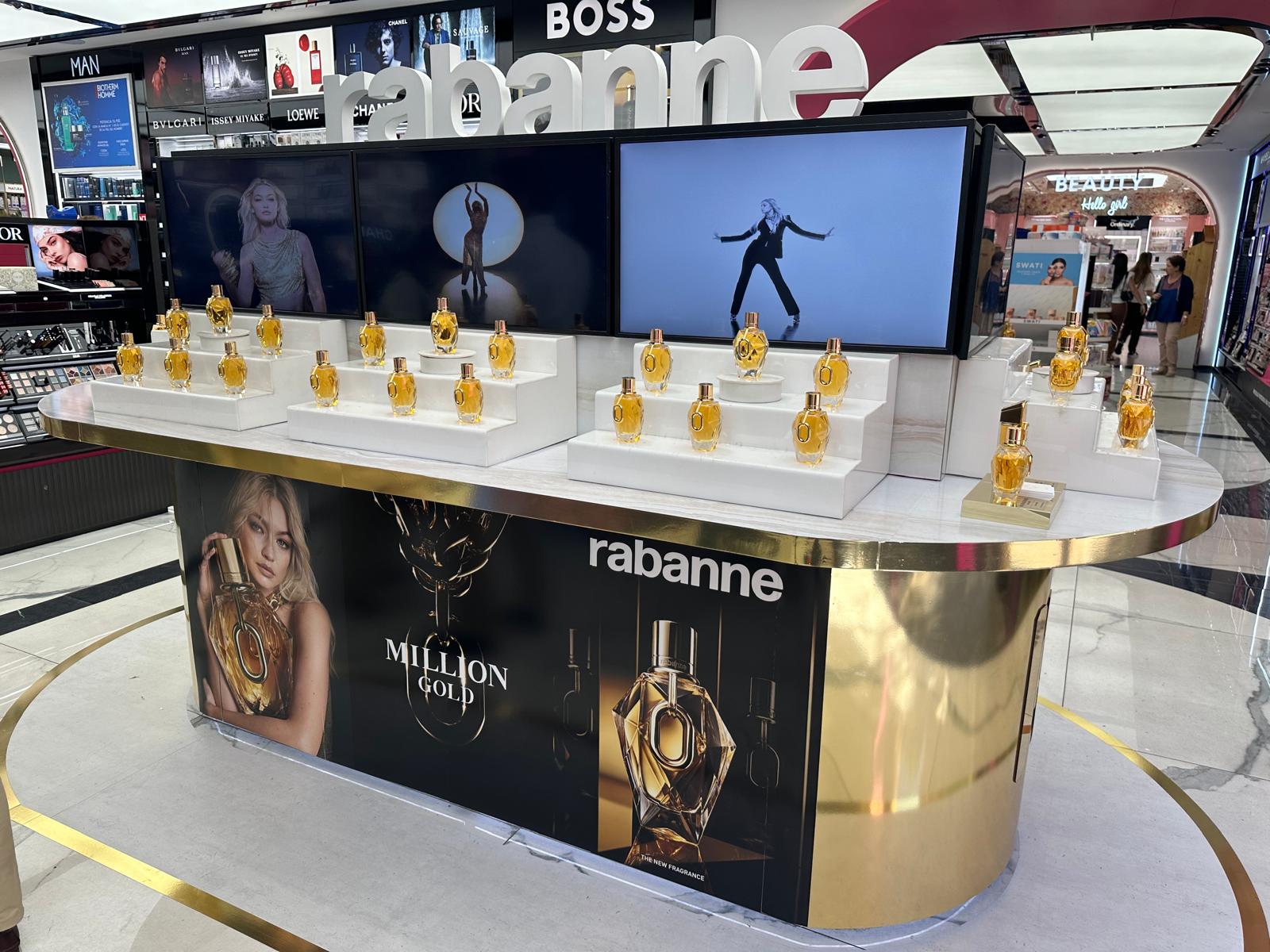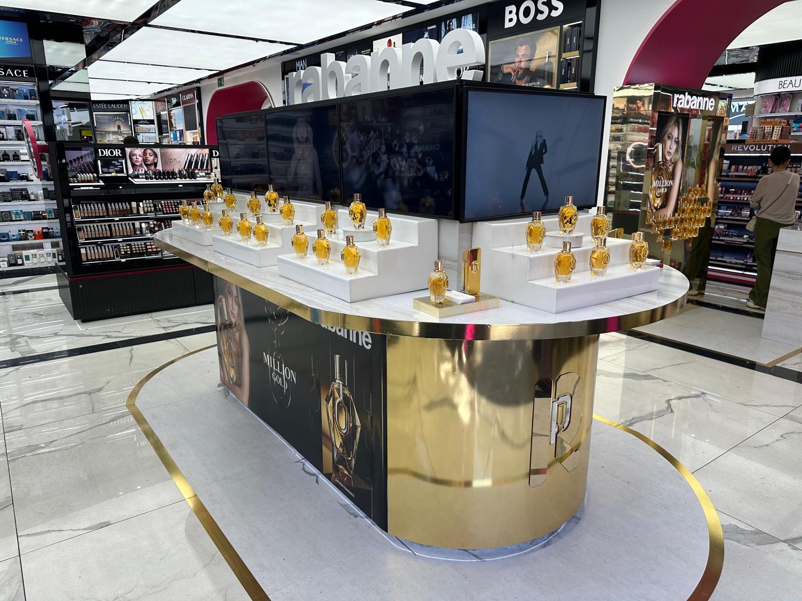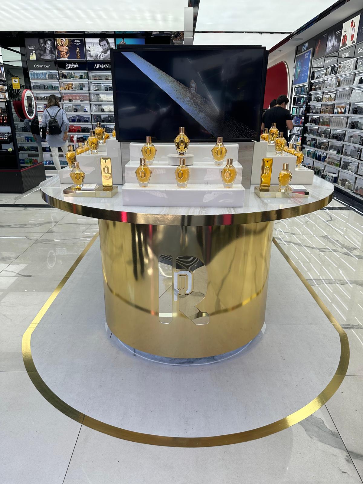 Espacio promocional para Rabanne – Million Gold, con dos zonas independientes, una con mostrador en DM vinilado y trasera y otra con góndola personalizada en bandoxal oro brillo